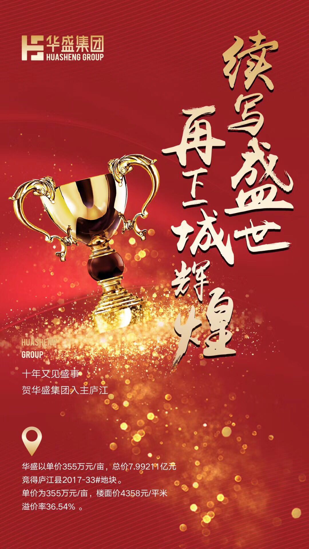 11月17日下午,华盛集团以单价355万元/亩,总价7.99211亿元,楼面价4358元/平米,溢价率36.54%成功竞得庐江县2017—33号地块,入主庐江,再续辉煌!