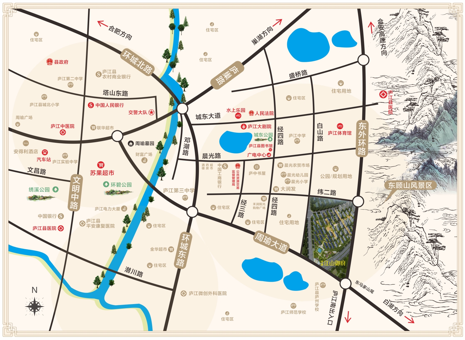 项目位于庐江城东新区板块,用地东侧紧邻东外环路,西侧紧依白山路,北侧为龙桥路,南侧为周瑜大道,毗邻公交车站,交通网络四通八达,北侧距县医院直线距离约2公里,距冶父山国家森林公园直线距离约为8.2公里,西侧距庐江汽车站直线距离约为4.7公里,周边一公里庐江一中、幼儿园学区配套丰富。尽享10分钟城市核心生活圈,出则畅达,入则隐逸。规划上运用空间跌落手法与东顾山进行呼应,境藏“东大河—水体公园—东顾山”山水轴线。以“东方精神”为设计灵魂,引入传统徽式宅居多进院落结构体系,以充分的文化自信贯穿街、园、巷、院,匠心雕琢“九境人生、五重礼序”。是华盛集团在庐江打造的顶级豪华社区。