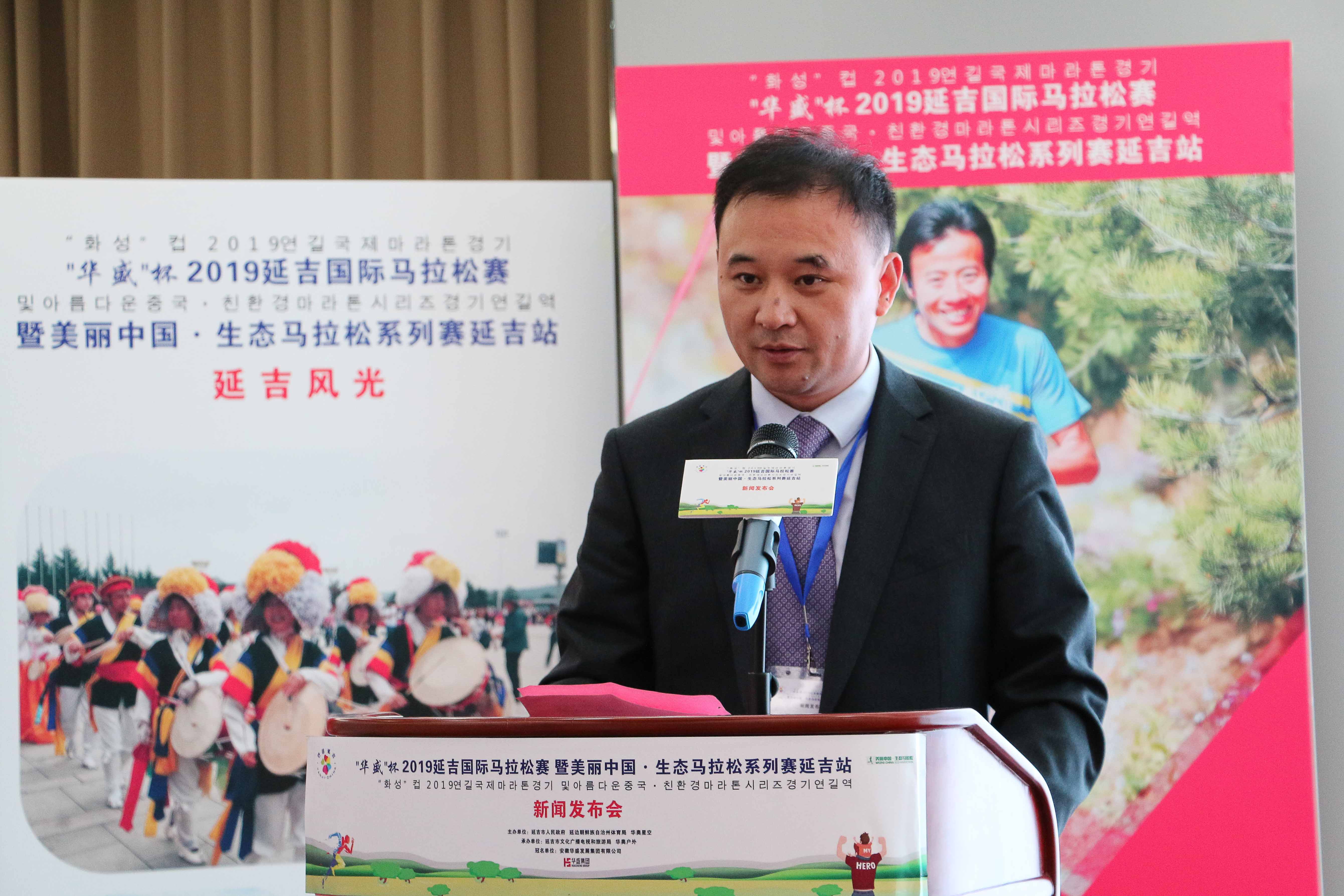 华盛集团总裁丁长亮先生在新闻发布会上发表致辞:延吉是“中国优秀旅游城市”“中国足球之乡”,延边足球声名远扬,延吉体育赛事方兴未艾。2019延吉国际生态马拉松紧跟当下回归自然、生态、环保的国际趋势与潮流,竭力推动少数民族地区群众体育运动,努力倡导健康生活新方式,深度促进全民健身与全民健康融合发展。此次2019“美丽中国•延吉国际生态马拉松”将是一场体力、耐力、执着力的比拼。
