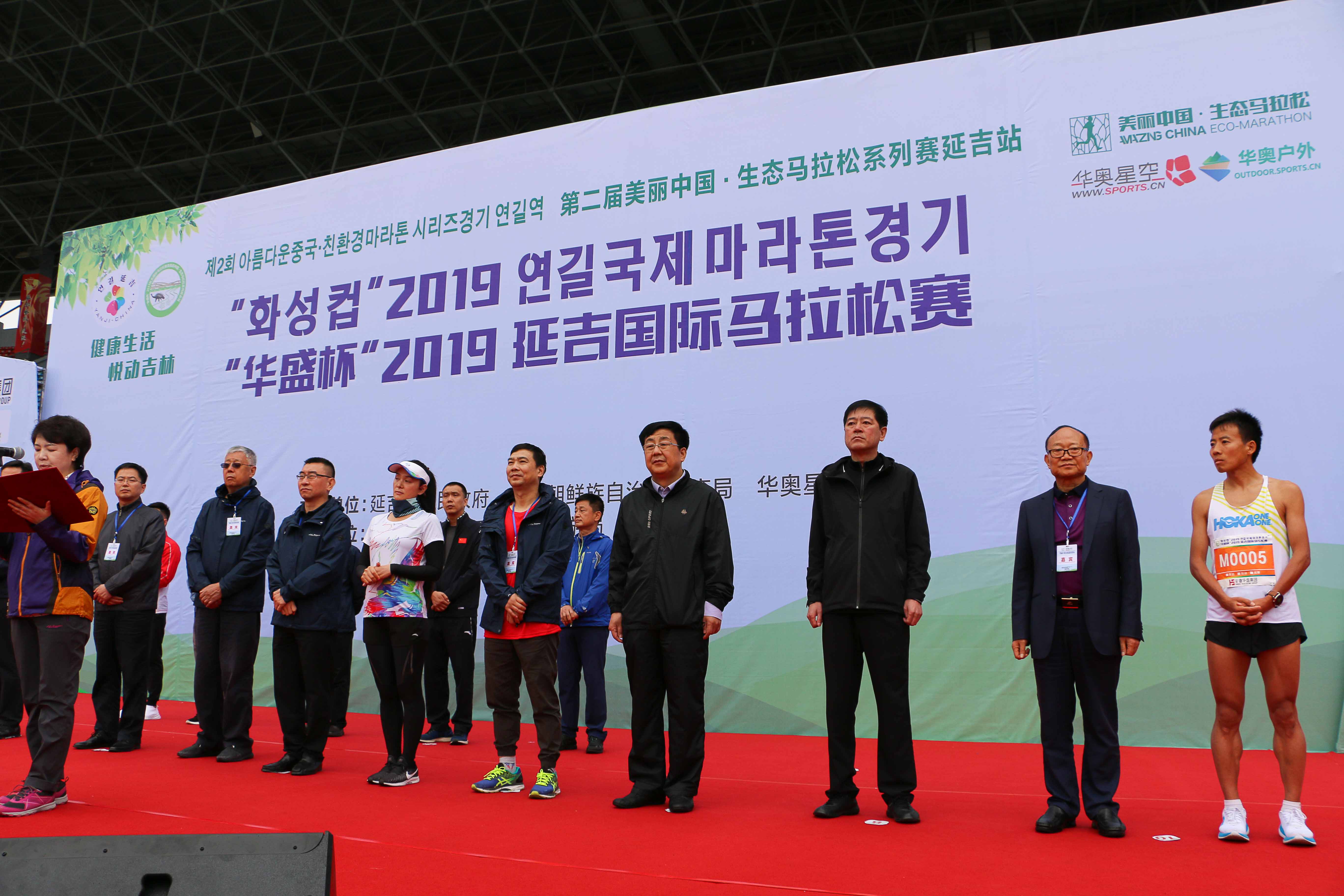 本届延吉马拉松邀请到国家体育总局原副局长王钧,国家体育总局青少司副司长王雷,国家体育总局体育器材装备中心副主任刘成亮,中国体育报业总社副社长兼华奥星空董事长叶春,国家体育总局群体司赛事活动处处长何红宇,国家体育总局群体司赛事活动处副调研员韩忠爱,吉林省体育局副局长韩俊华,延边州人民政府副州长朴学洙,延边州体育局副局长李英哲,中共延吉市委常务副书记尹朝晖,中共延吉市委副书记、市政府市长蔡奎龙,延吉市人大常委会主任赵义弘,延吉市政协主席朴林虎,延吉市委常委、市政府党组成员金昌律,安徽华盛发展集团有限公司董事长王汝仙等领导嘉宾出席现场开幕式,并与现场观众奏唱国歌,为延马拉开序幕。
