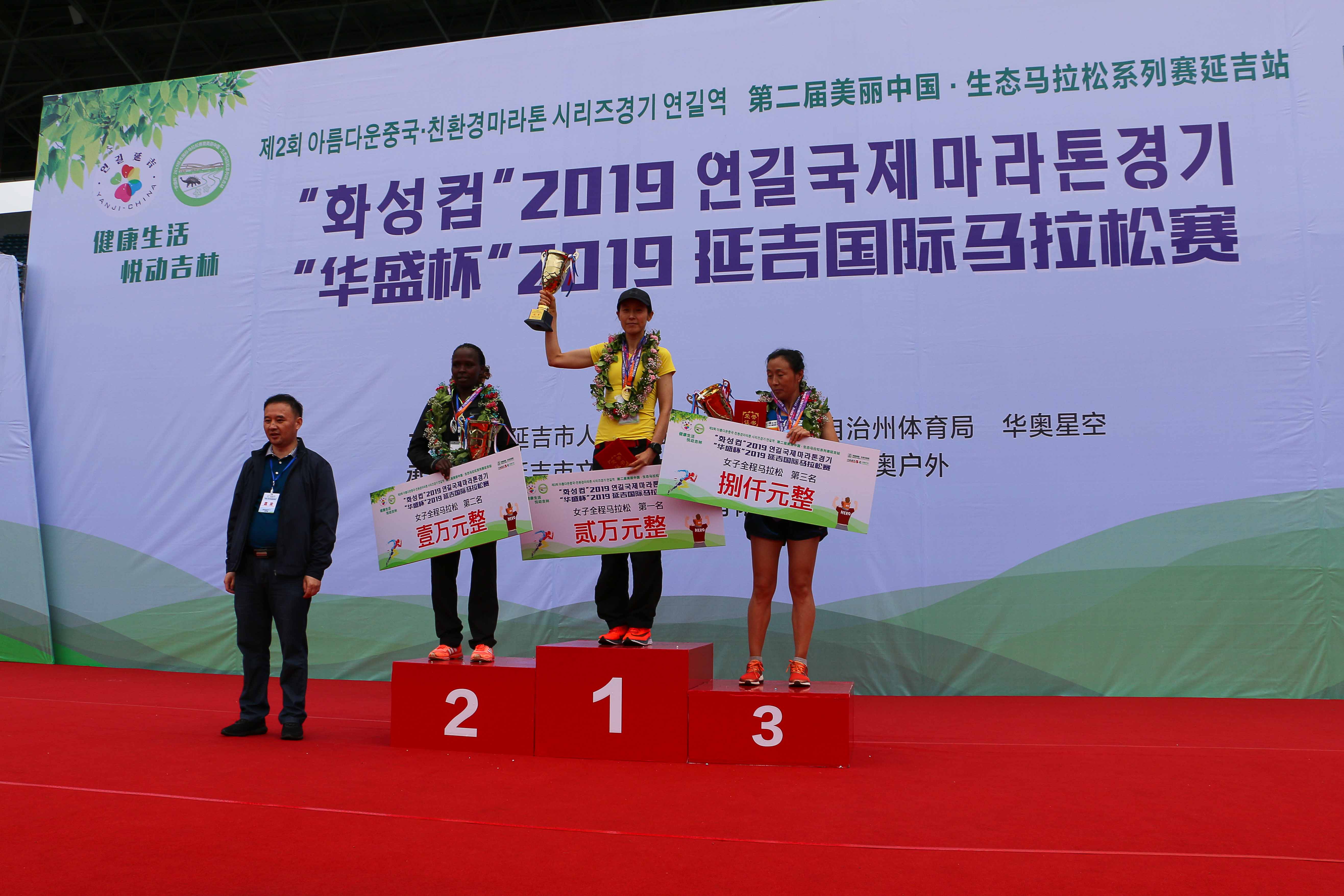 (华盛集团总裁丁长亮先生为“华盛杯”2019延吉国际马拉松赛女子全程马拉松获奖选手颁奖)