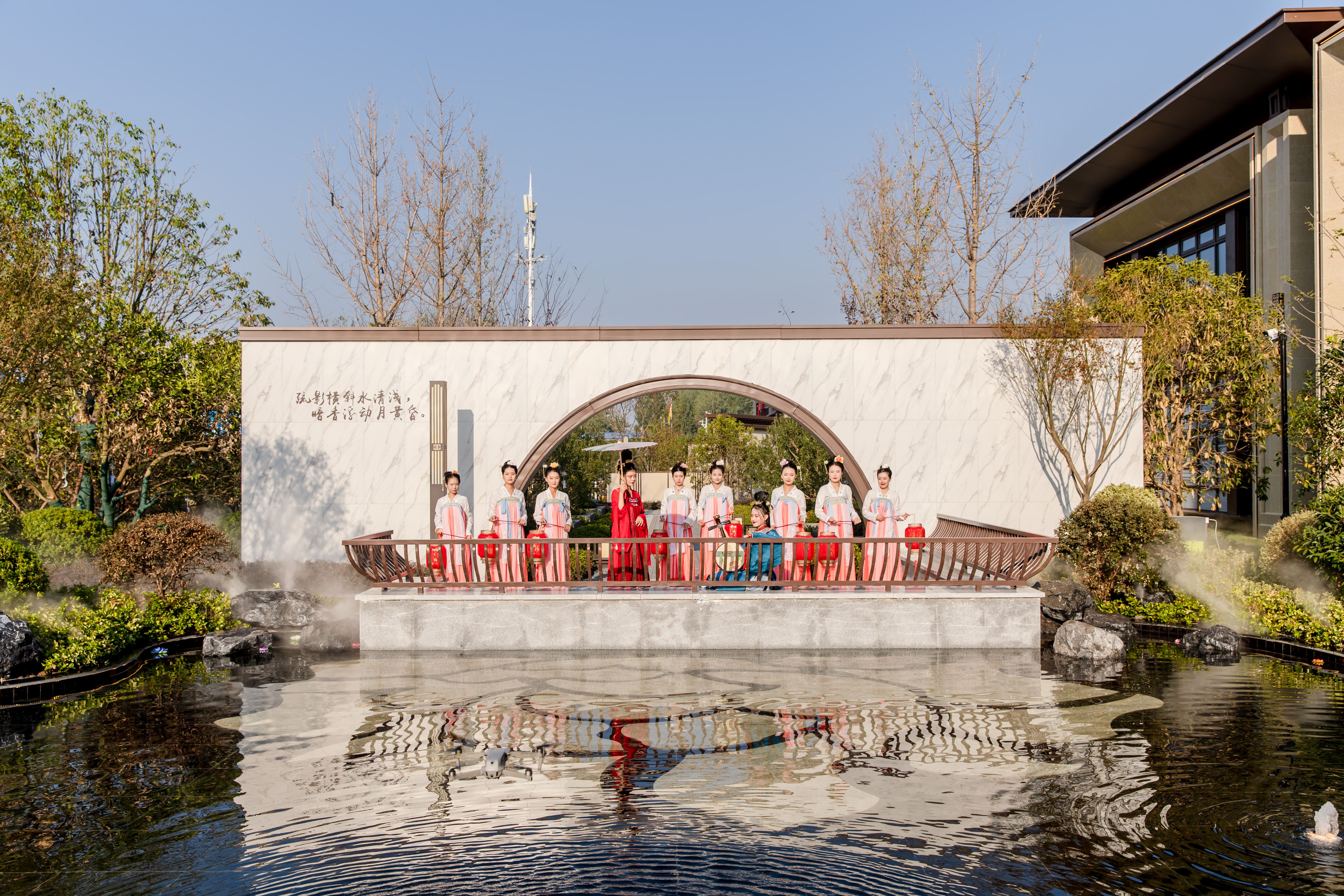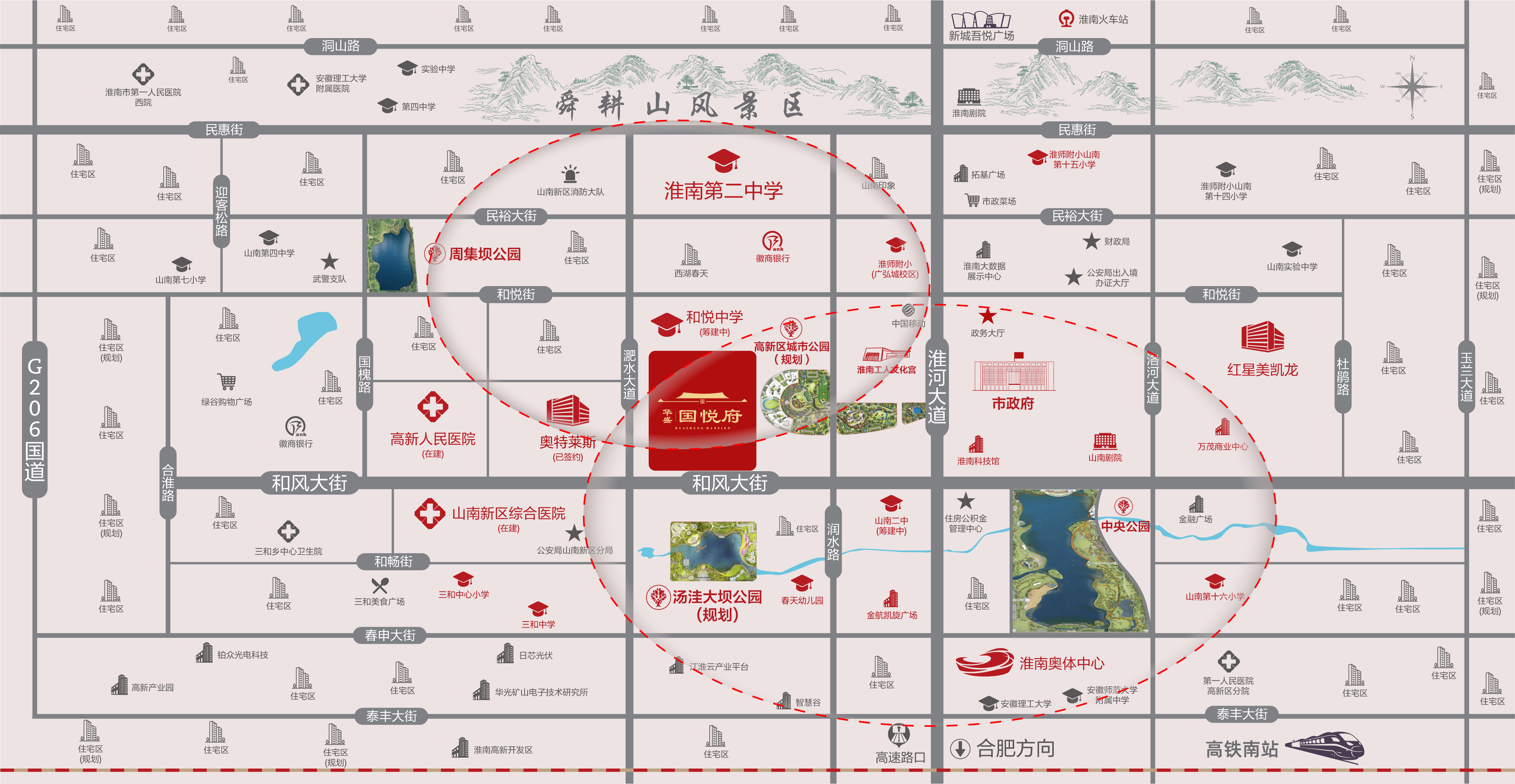 华盛·国悦府项目坐落于淮南市山南新区和风大街与淝水大道交口东北侧,以三纵三横路网串联淮南政、教、商、景、娱等一站式醇熟资源。项目总占地约77.36亩,总建面约140526㎡,由花园洋房+瞰景高层+沿街商业组成。内部遵循东方规制,打造国风九境园林景观,为淮南呈现一座中式国风华宅。